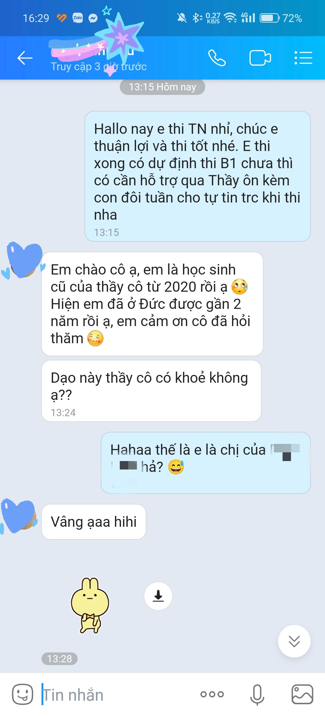 Học ở đây đã giúp em nắm vững kiến thức tiếng Đức trong thời gian ngắn. Khi em thi đỗ B1 và sang Đức lâu rồi thì một vài người bạn của em học ở trung tâm khác vẫn đang học chương trình tiếng Đức A2.